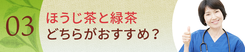 また、カフェインやカテキンといった成分は加熱により減少する為、緑茶と比べてほうじ茶には少な目。ですが、カフェインの摂取量を抑えたい方や、カテキンが持つ苦み渋みを好まない方にはほうじ茶がおすすめです。